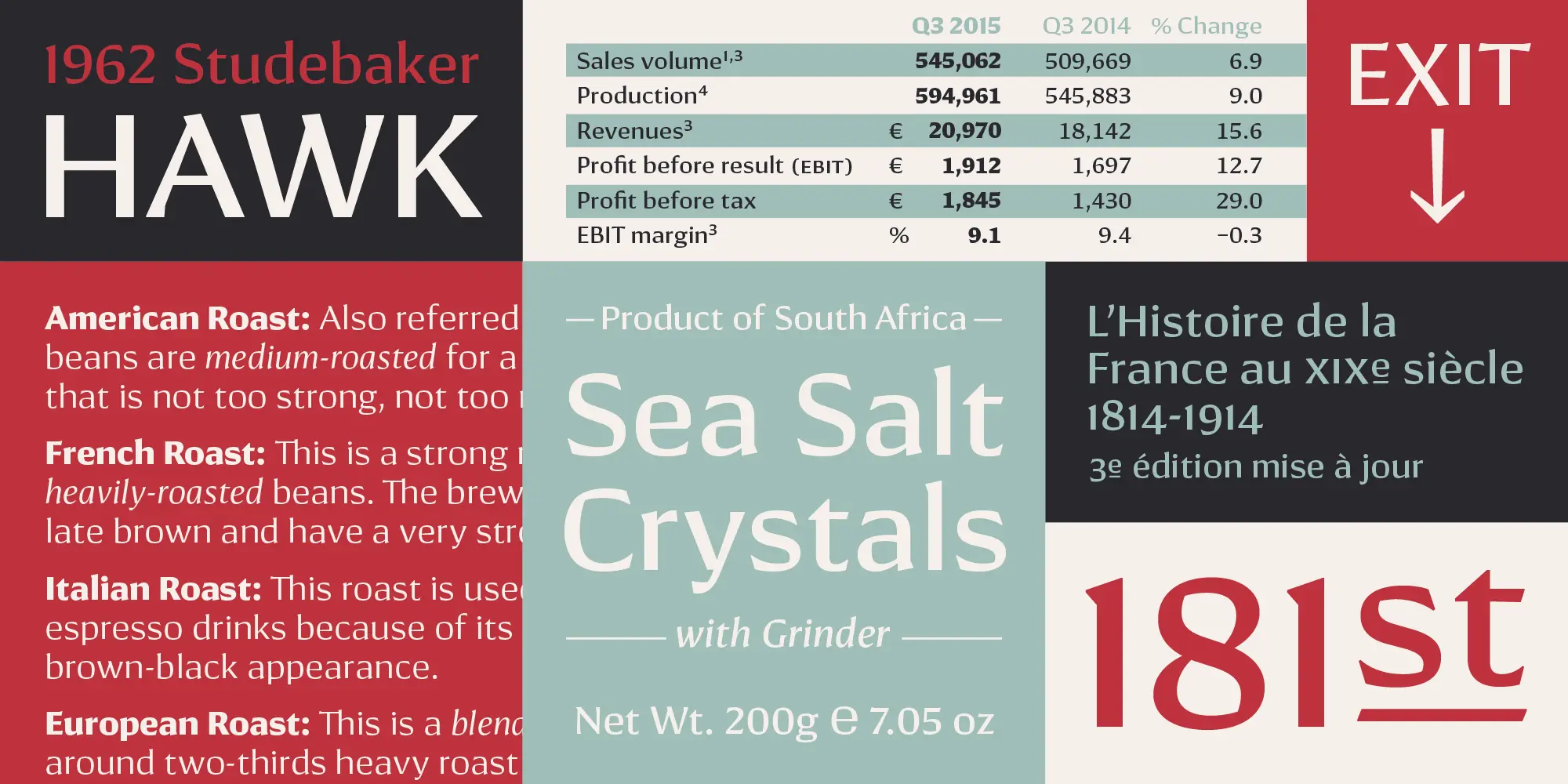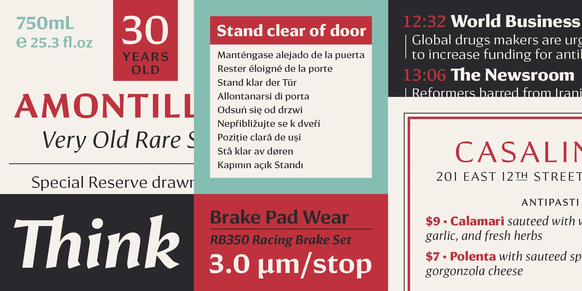 Conglomerate features large, open counters for legibility in text yet crisp, sharp details that sparkle at display sizes. Each style also contains an extensive set of OpenType features, including small caps, proportional, tabular, lining, and old style numerals, case-sensitive punctuation, ligatures, arbitrary fractions, localized forms, and elevated, underlined ordinal indicators for English, French, Spanish, Italian, and other languages.