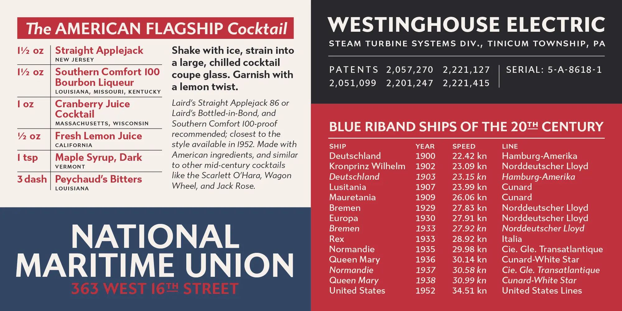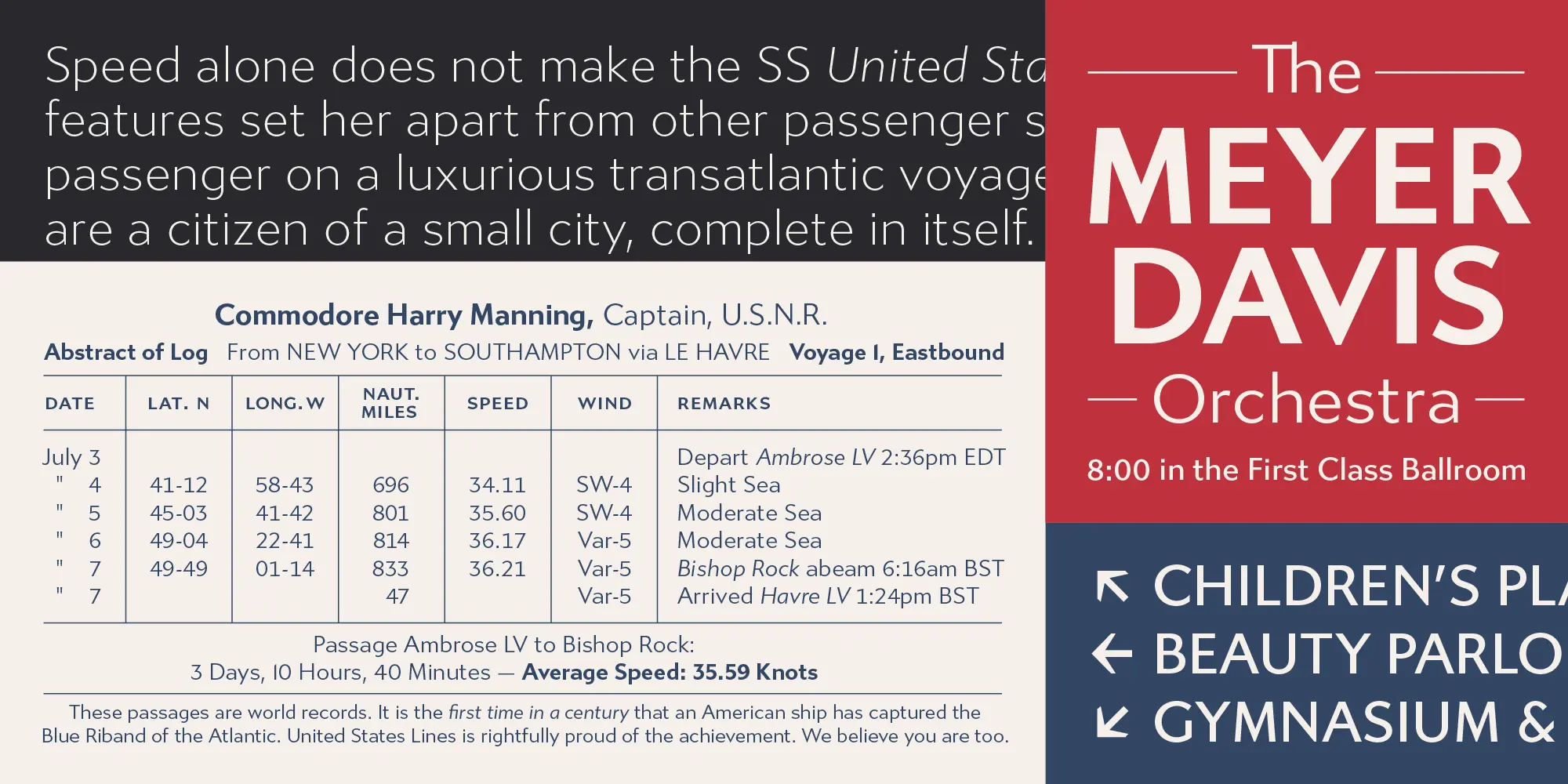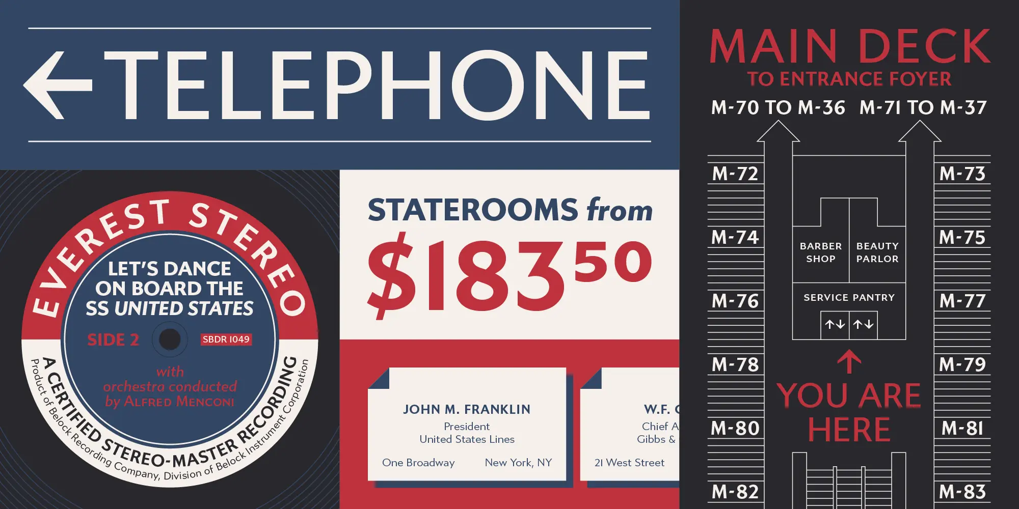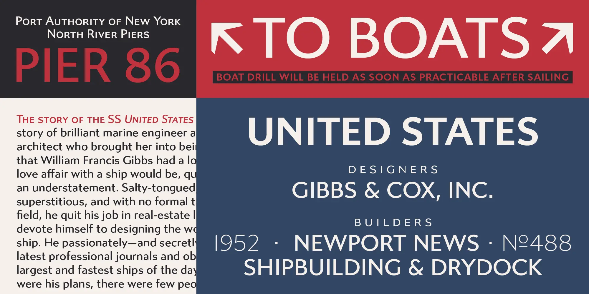 The distinctive caps of Gibbs (named for the ship’s designer, William Francis Gibbs) were based on the mid-century cast aluminum signs found on board the ship in its heyday. The result is a tough, sophisticated, and transatlantic sans with a little bit of quirk, in between industrial American vernacular lettering and the English humanist styles of Gill or Johnston.